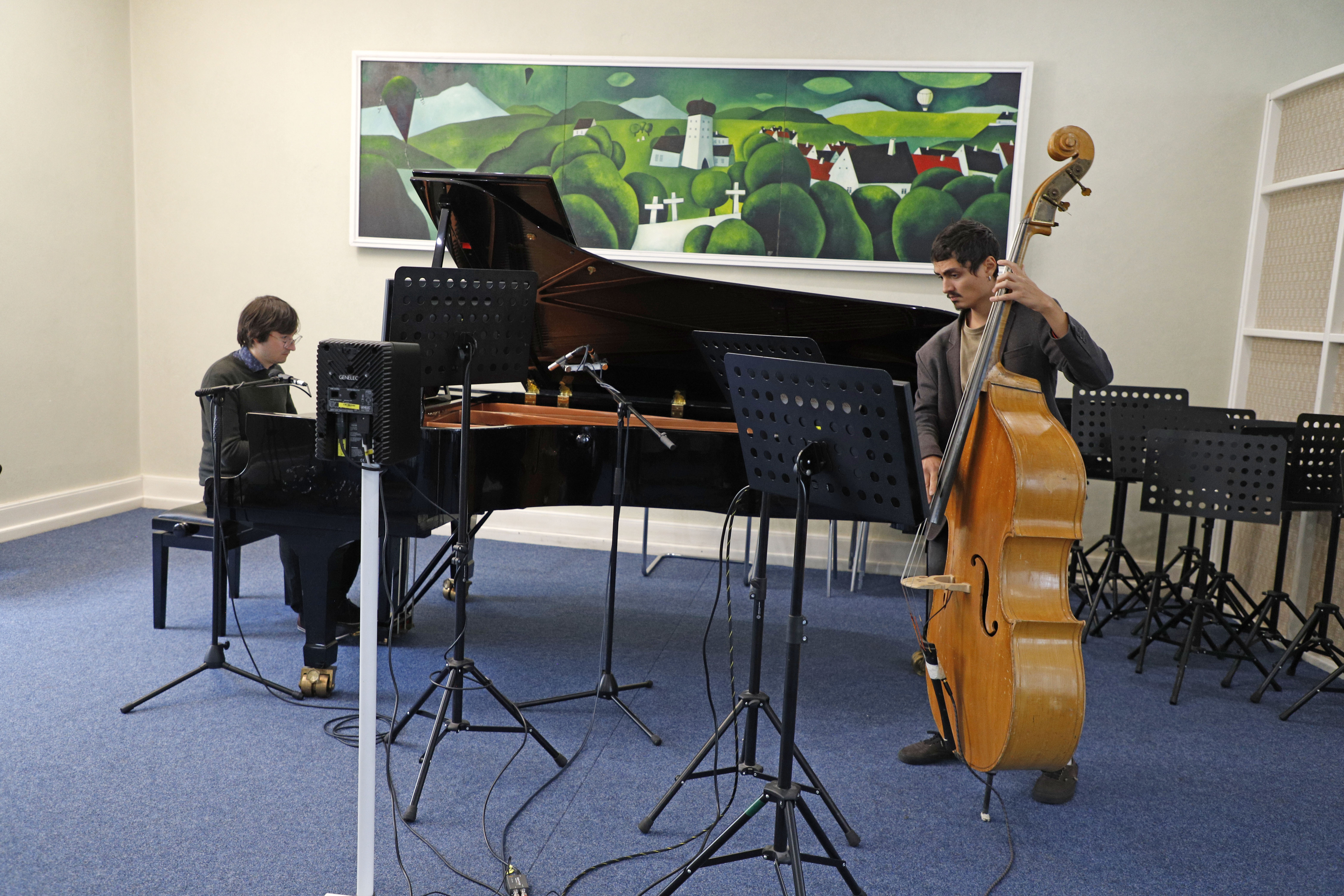 In the Global Jazz Café performance, a pianist Jan Pudlák in Prague and David Spencer in Vilnius, a soloist and a professor of trumpet from the University of Memphis performed three pieces together: Mr. P.C., There is no great love and Bye, Bye, Blackbird.