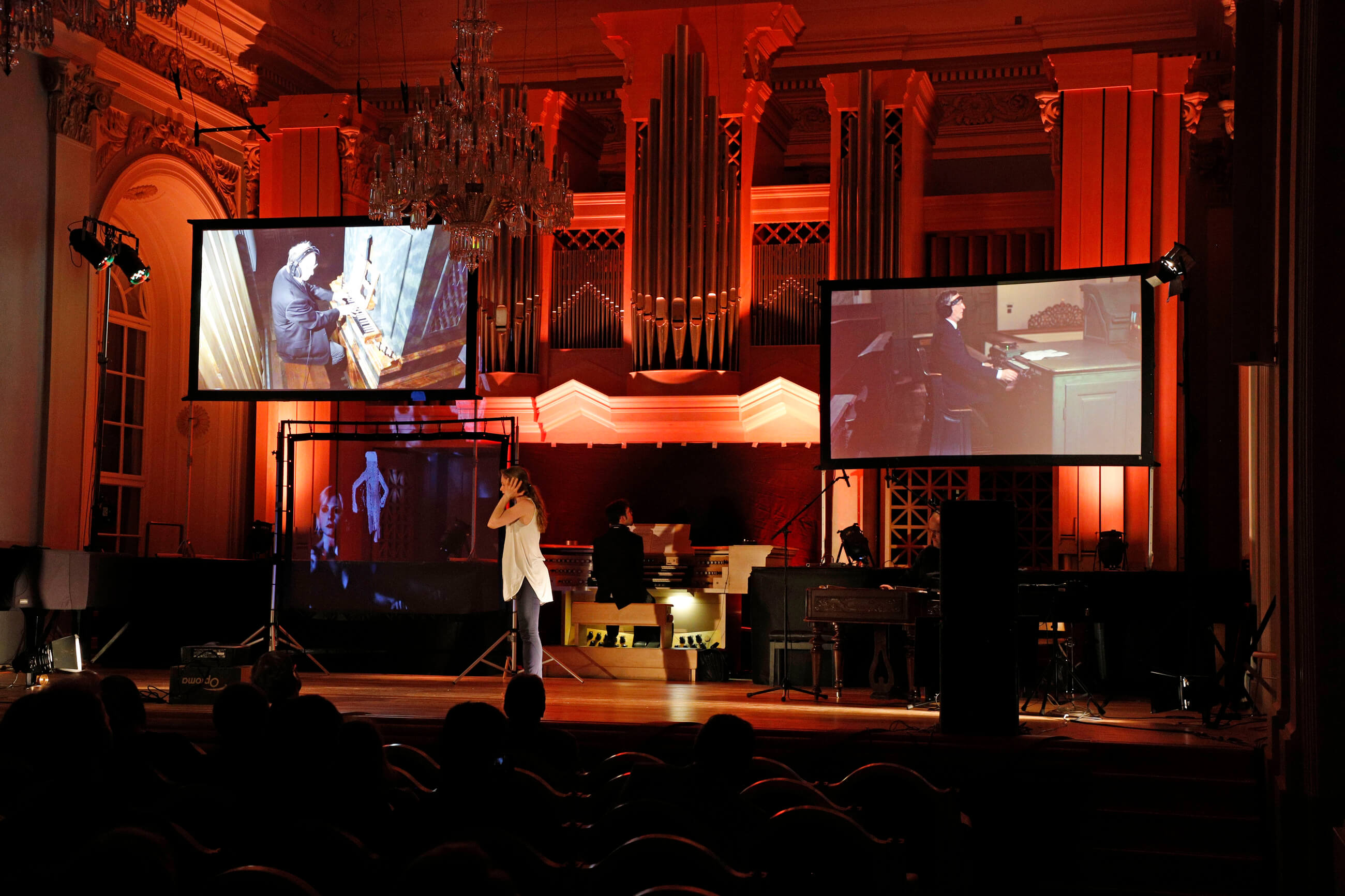 Three organs connected together in real time along with a cimbalom and record flutes