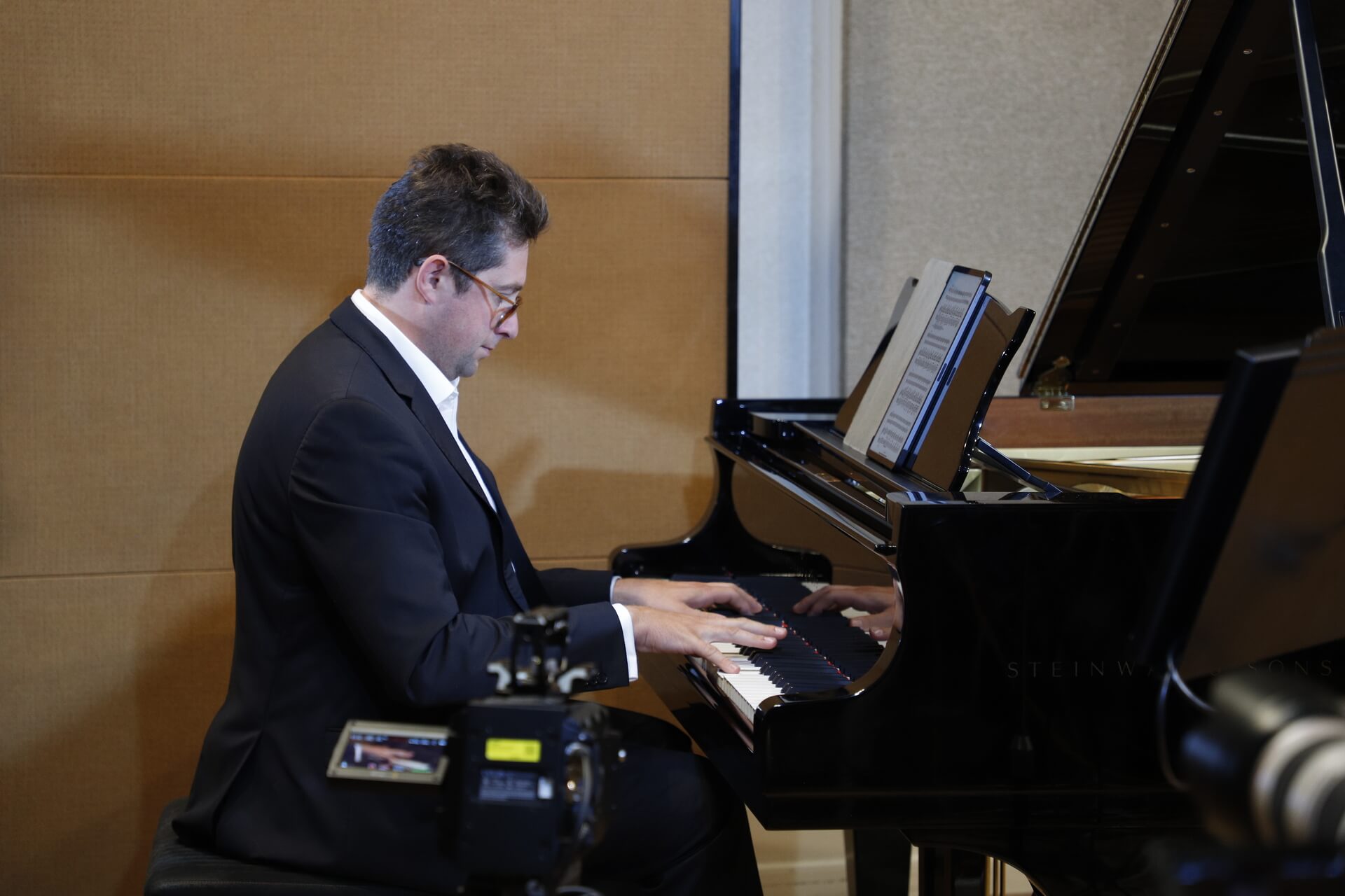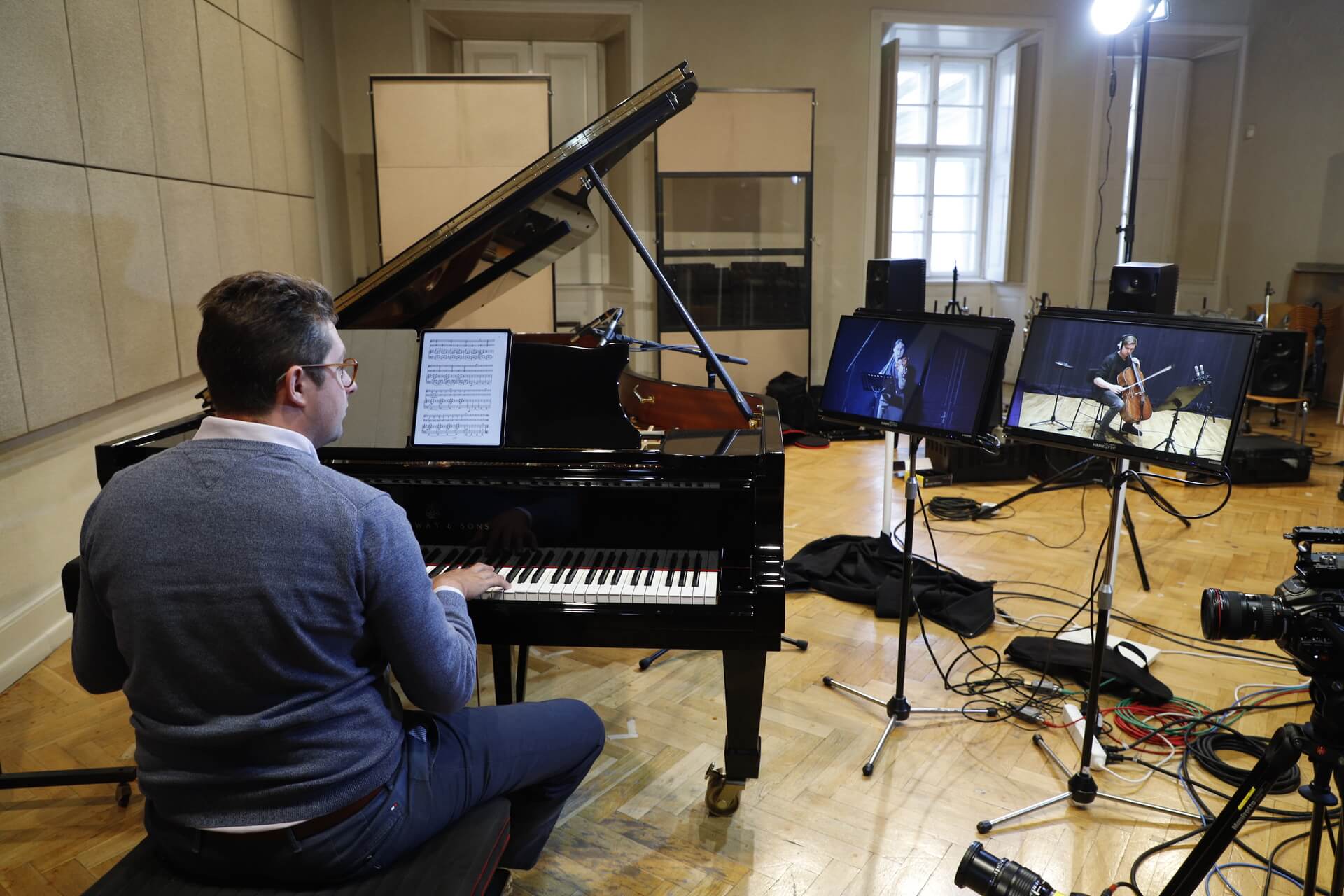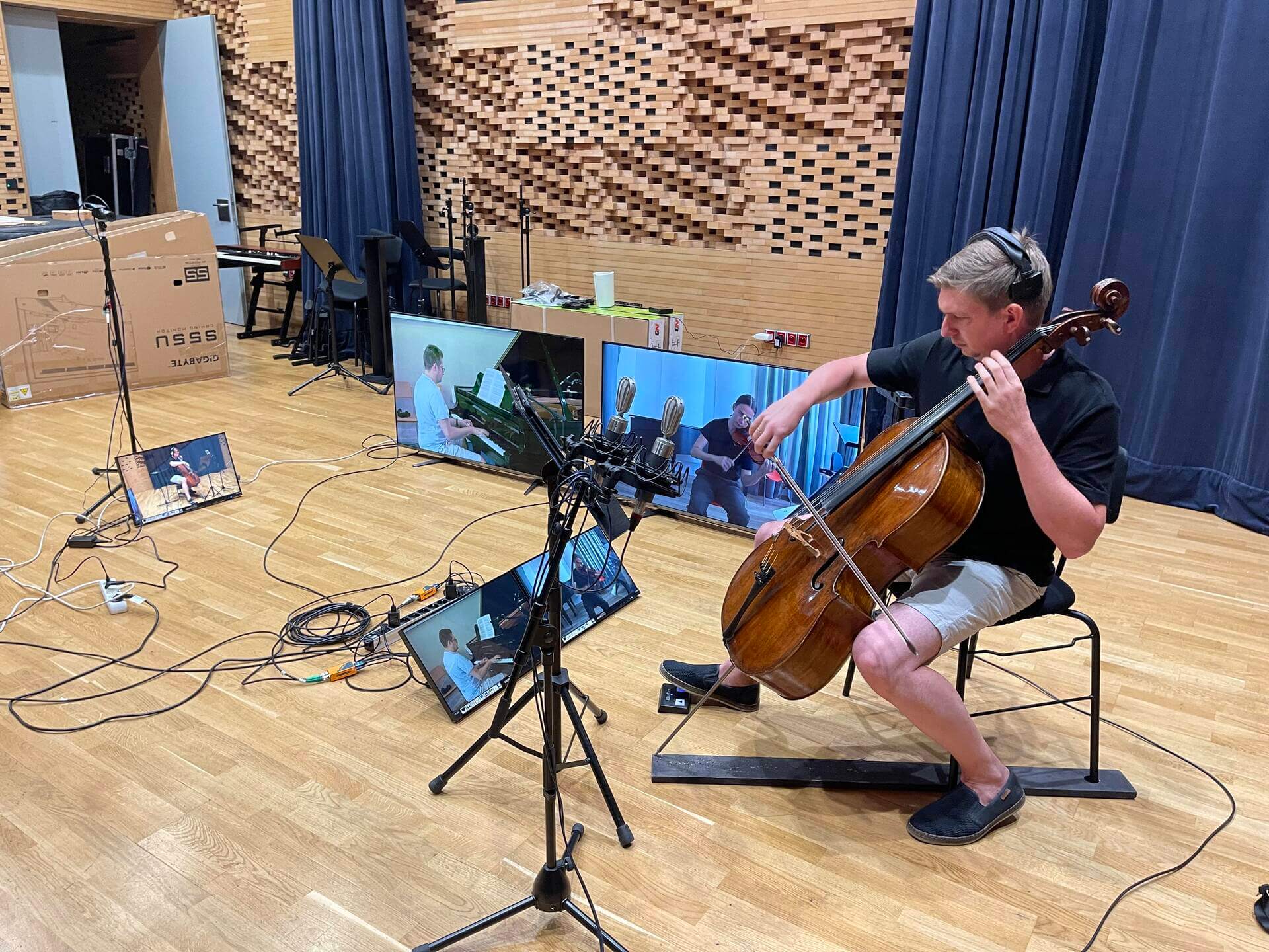 Musicians in three music academies were playing simultaneously. A pianist Lukáš Klánský at HAMU in Prague, a cellist Tomáš Jamník at JAMU in Brno and a violinist Jakub Pronskus at LMTA in Vilnius played the Piano Trio in G minor, Opus 15 by Bedřich Smetana.